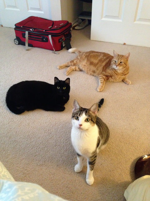 We traveled cross-country with our two older cats a couple summers ago (from Ohio to Oregon), and we've now traveled with all three cats to the east coast and back twice. We've gotten really good at catching the cats and loading them into the car, moving them and their accessories in and out of hotel rooms, and setting them up at their vacation locations.